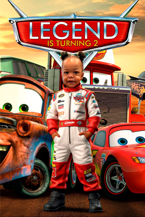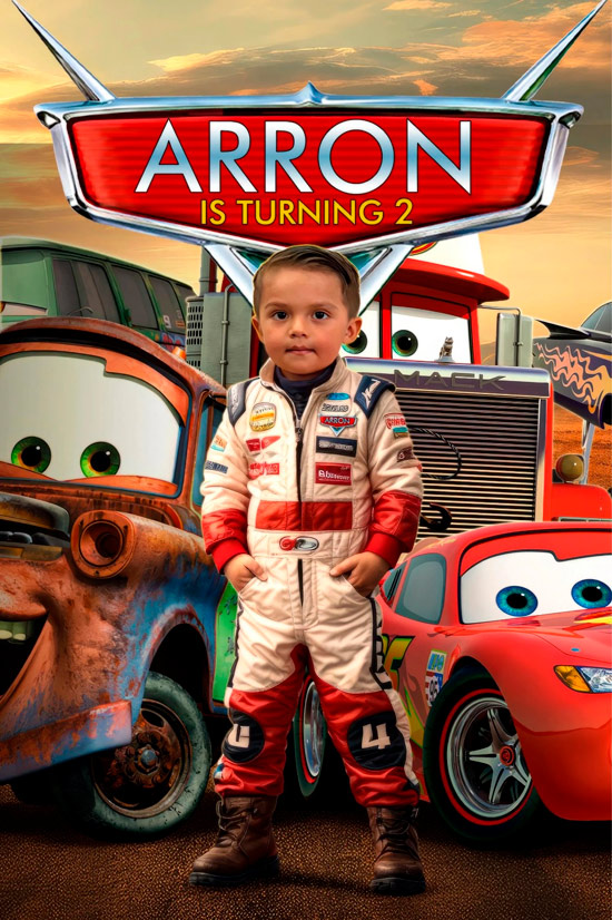 Premium Manual Photo Blending: Your child is perfectly integrated into the Cars world with professional, hand-crafted precision.