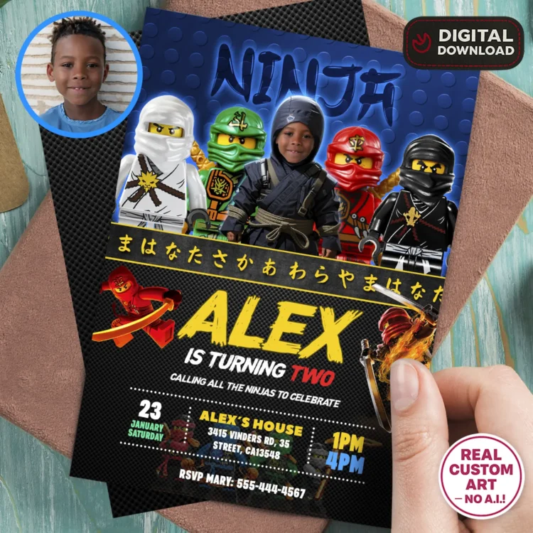 Turn your child into a fearless ninja with our Lego Ninjago Birthday Invitation with Photo!