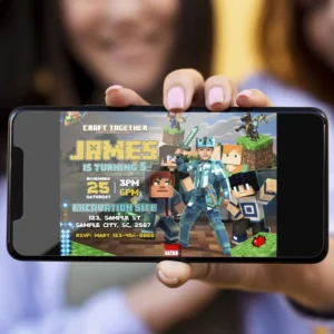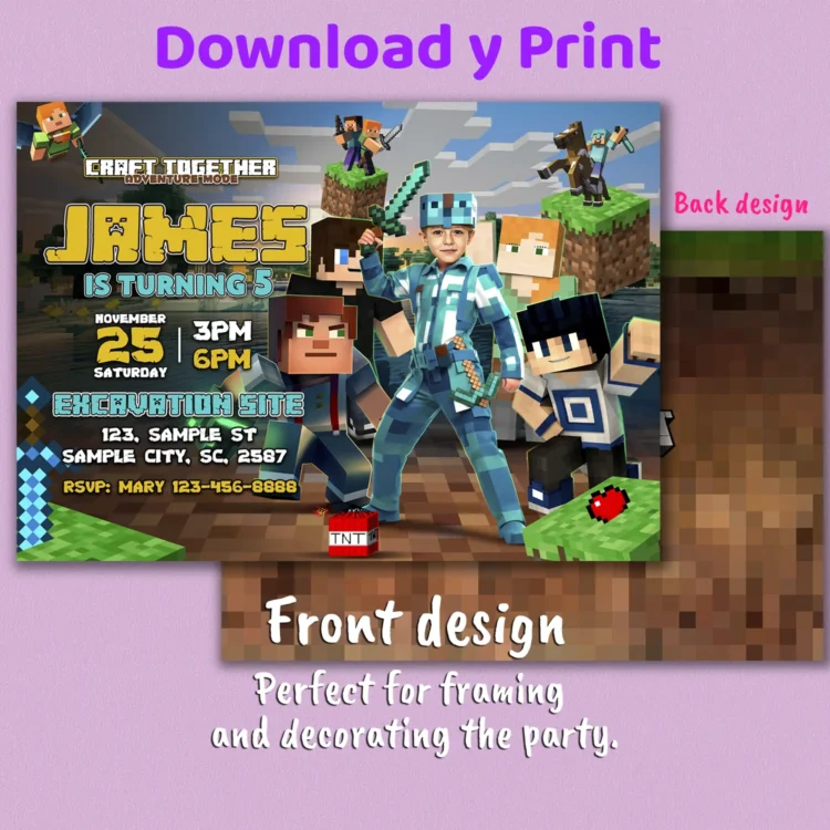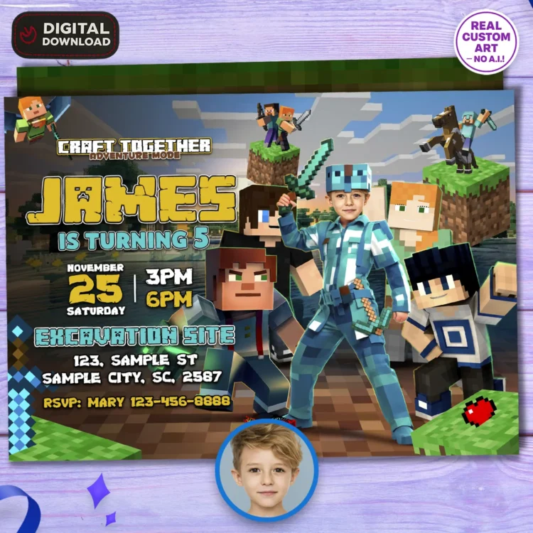 Each invitation is hand-edited — no AI or templates — to blend your child’s face naturally into the legendary diamond armor, ready to battle mobs and celebrate in pixel-perfect style.