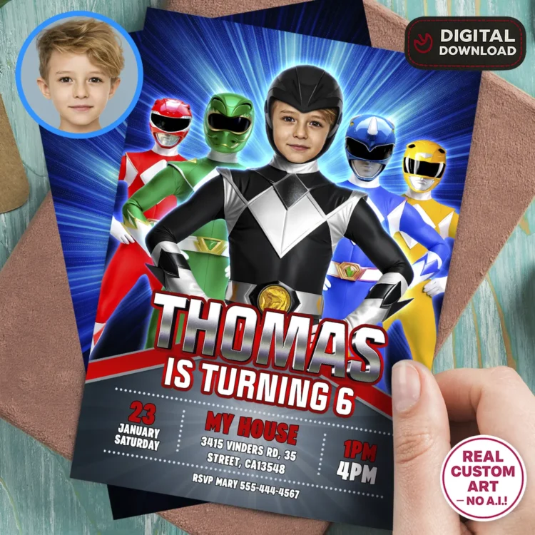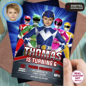 Transform your child into a hero with our Power Rangers Birthday Invitation with Photo — available in five dynamic colors: red, blue, green, black, and pink.