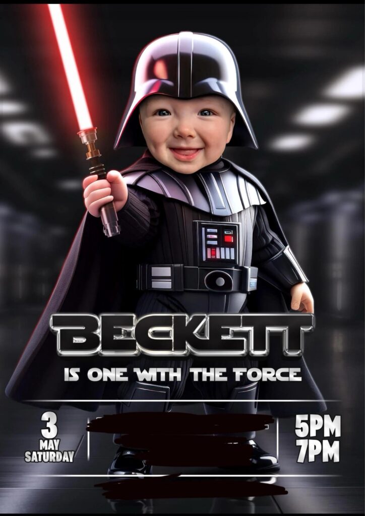 Bring the Force to your child’s birthday with our Baby Vader Birthday Invitation — a creative, adorable twist on the galaxy’s most iconic villain.