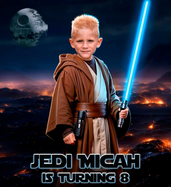 We manually adjust lighting, shadows, and saber glow for realistic results, ensuring your child looks like a true Jedi warrior (or young Sith apprentice!).