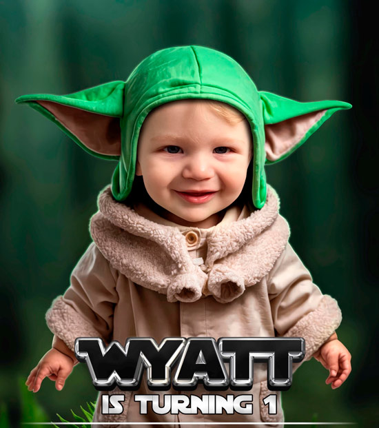 Each invitation is individually hand-edited β no AI, no templates β to place your baby in a Grogu-inspired scene: soft green glow, big-ear styling cues (tasteful & cute), cozy robe details, floating pram / desert or swamp backdrops, subtle star particles, and gentle rim lighting for an enchanting, cinematic look.